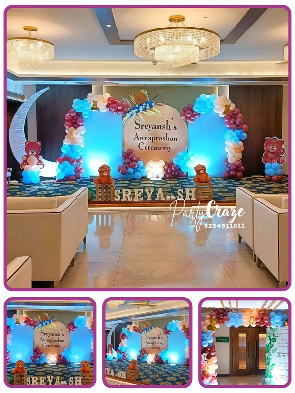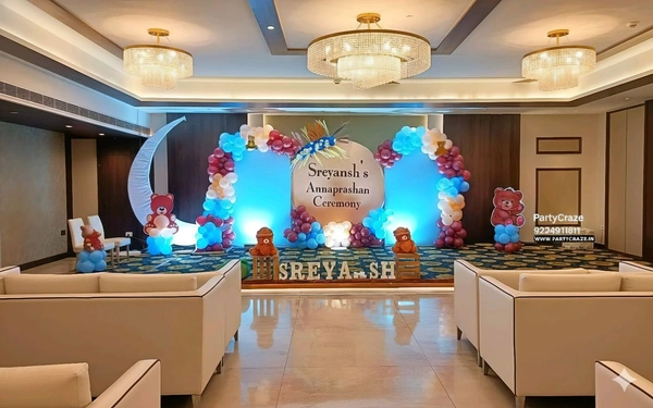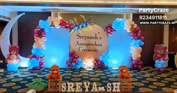 Our Annaprashan decorations blend traditional elements with modern aesthetics, using soft pastel themes, floral arrangements, balloons, fabric drapes, and customized backdrops. From classic ethnic décor with diyas, flowers, and motifs to contemporary themes with name boards and cute baby props, every detail is designed to reflect love, purity, and celebration.
