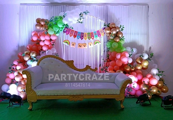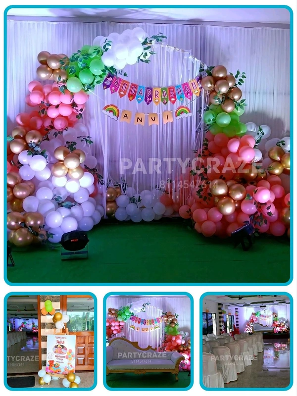 Our Annaprashan decorations blend traditional elements with modern aesthetics, using soft pastel themes, floral arrangements, balloons, fabric drapes, and customized backdrops. From classic ethnic décor with diyas, flowers, and motifs to contemporary themes with name boards and cute baby props, every detail is designed to reflect love, purity, and celebration.
