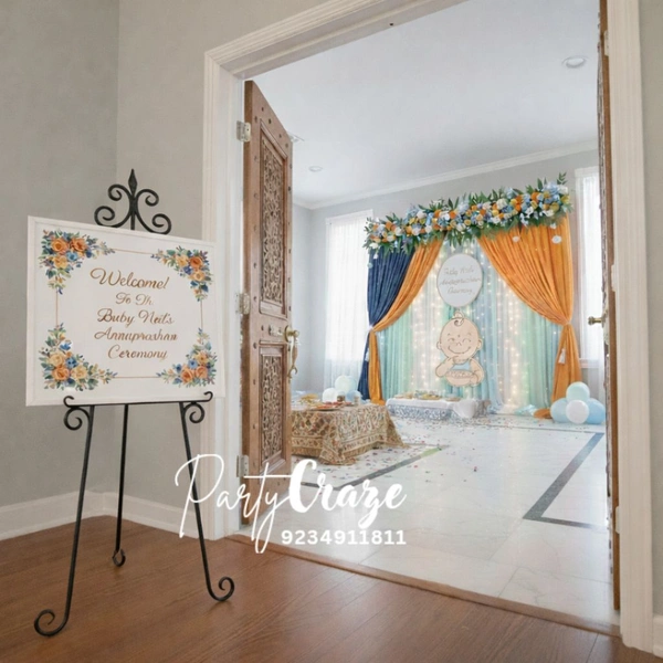Our Annaprashan decorations blend traditional elements with modern aesthetics, using soft pastel themes, floral arrangements, balloons, fabric drapes, and customized backdrops. From classic ethnic décor with diyas, flowers, and motifs to contemporary themes with name boards and cute baby props, every detail is designed to reflect love, purity, and celebration.