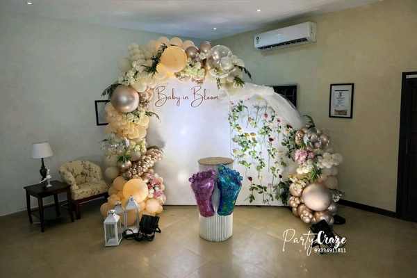 Themed Décor: Decoration with soft pastels, floral backdrops, banners, ribbons, and custom signage that reflect the joy of welcoming a new baby.