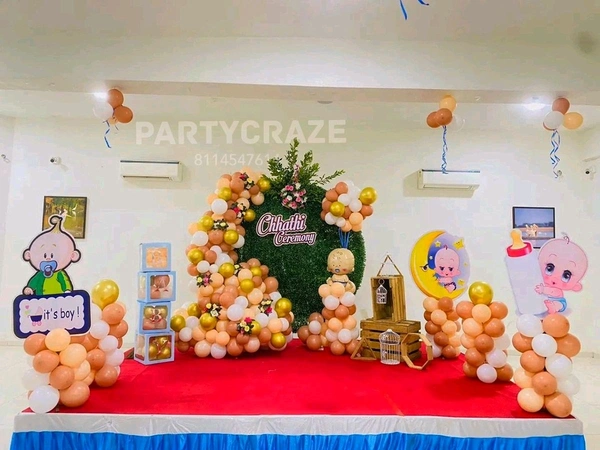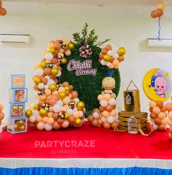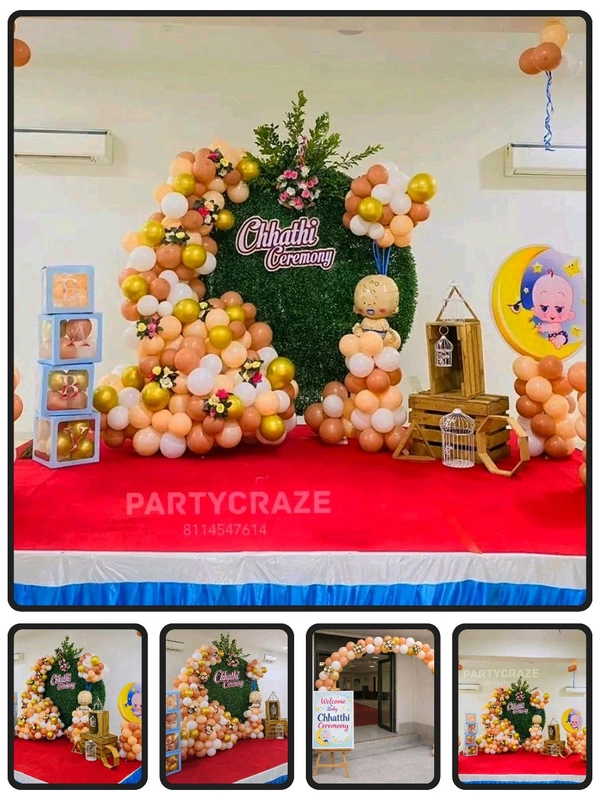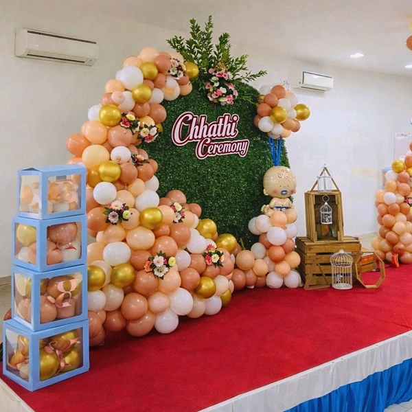 Chhatthi Ceremony decoration involves beautifying the space for the newborn’s sixth-day ceremony using balloons, backdrops, lights, name boards, and traditional decorative elements to create a warm and celebratory environment.