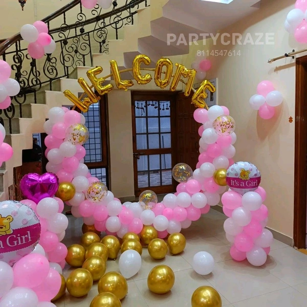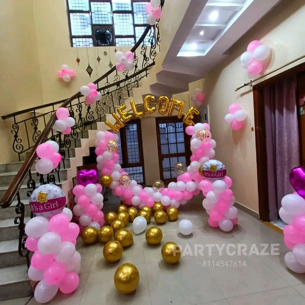 Our Baby Welcome Decoration typically includes themed balloon décor, welcome boards, baby props, ribbons, and customized elements. The final setup depends on the package you choose and your customization preferences.