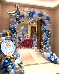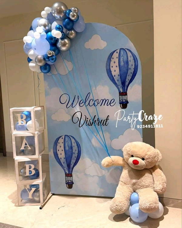 Our Baby Welcome Decoration typically includes themed balloon décor, welcome boards, baby props, ribbons, and customized elements. The final setup depends on the package you choose and your customization preferences.